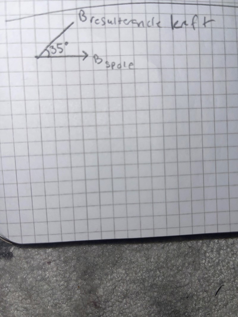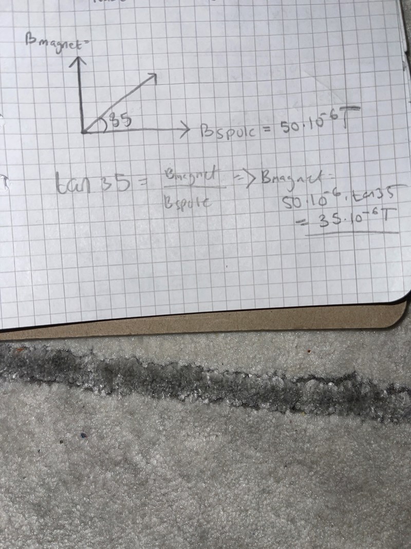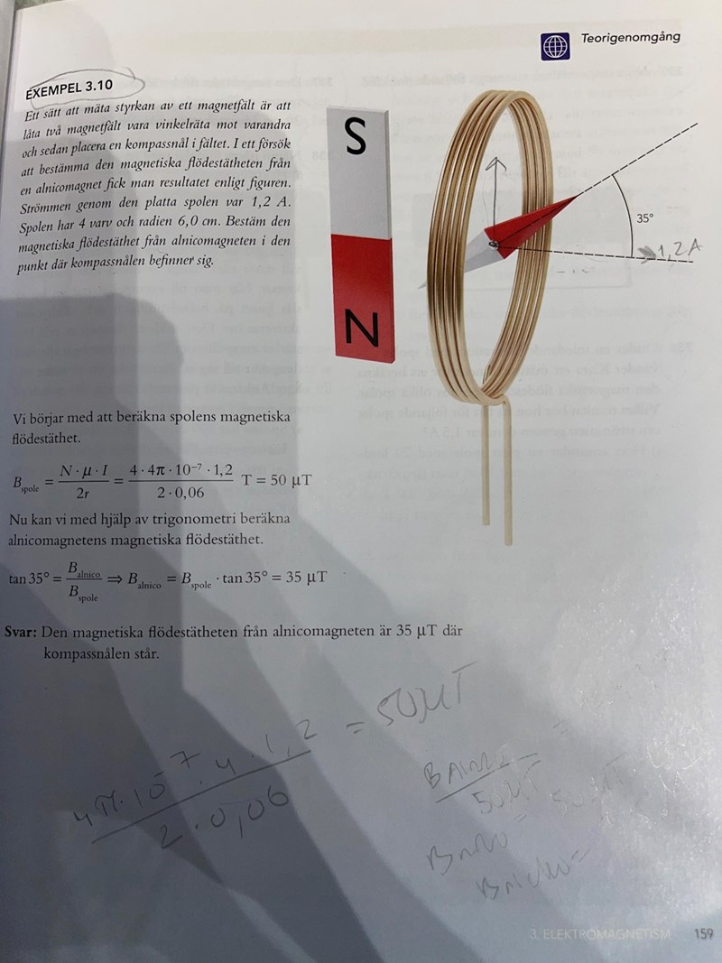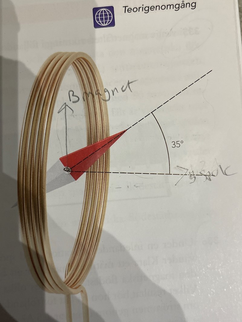 Nålen visar det resulterande magnetfältets riktning. Eftersom vi vet vinkeln och spolens magnetfält kan vi räkna ut permanentmagnetens bidrag.