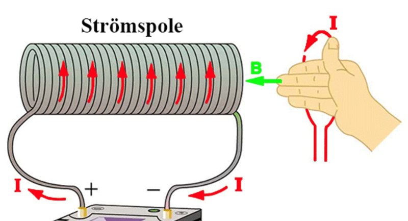 b) lära sig "högerhandsregeln för spole" som är att greppa spolen så att fingrarna kröker sig runt spolen med fingertopparna pekande i strömriktningen. Tummen visar då magnetfältets riktning. OBS: Detta är ingen ny regel, det blir så pga det som står i a). Jag brukar inte använda den eftersom jag inte gillar massa utantill-kunskap, jag använder "vanliga" högerhandregelen enligt a.