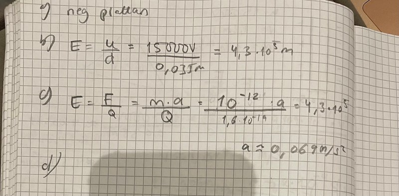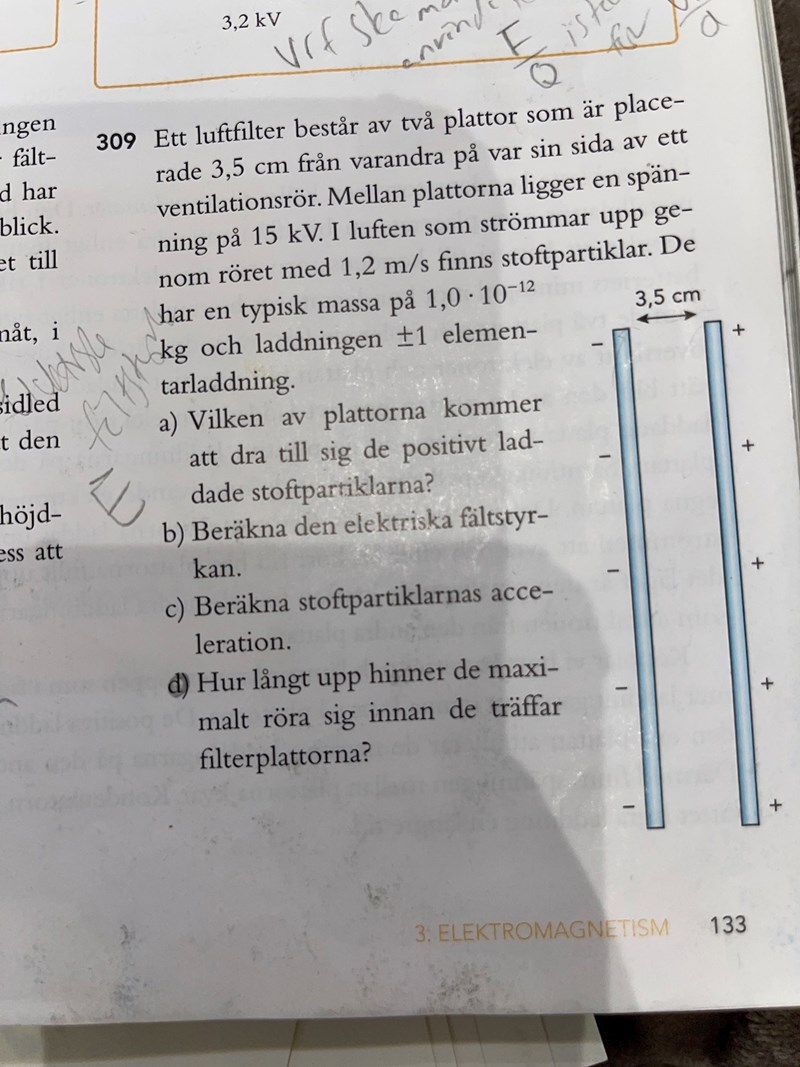 1. Partiklarna accelereras i horisontalled av det elektriska fältet. Hastigheten i denna riktningen är noll från början ökar sedan tills partikeln slår motsatta plattan. Hastigheten i vertikalled är konstant 1.2m/s