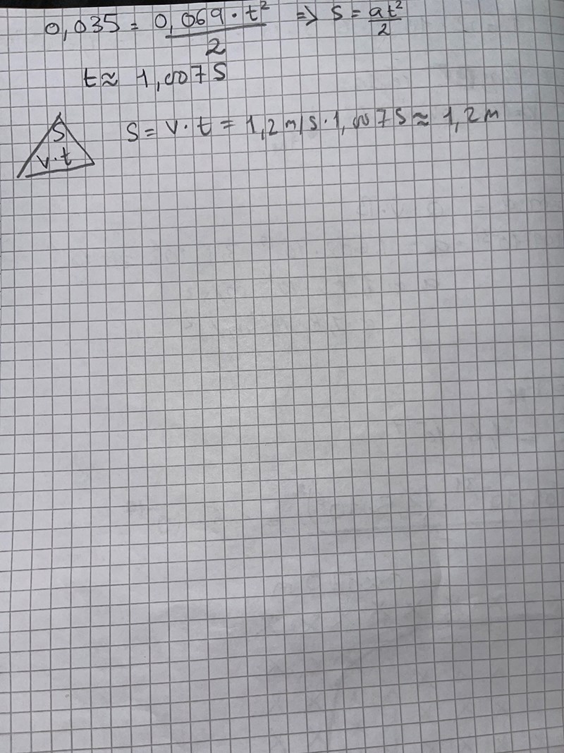 3. När jag väl har löst ut t ur formeln 0.5at2 ska jag då räkna ut den sökta sträckan s med hjälp av formeln s = v*t ? Där v=1.2m/s och t är det jag löser ut ur formeln 0.5at^2 ?