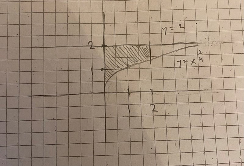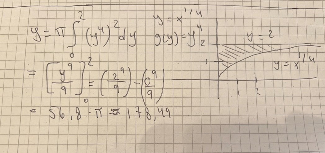 "Ett område begränsas av första kvadranten av kurvan och y=2 och y-axeln. En rotationskropp med volym bildas, vad är g(y)?"