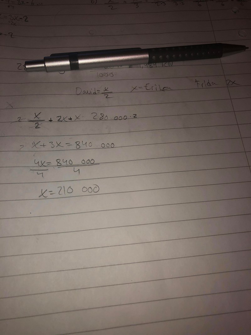 David, Erika och Frida ska dela på en lottovinst på 280 000kr. David ska få hälften så mycket som Erika och Frida ska få dubbelt som Erika.