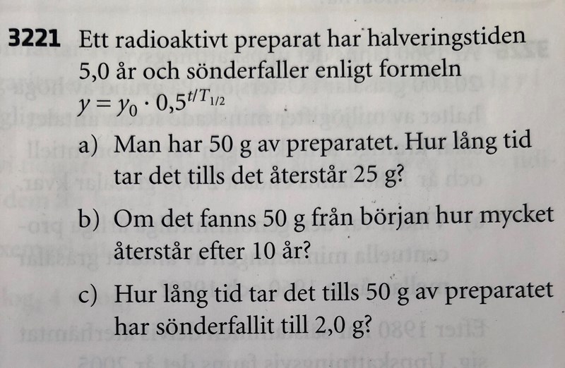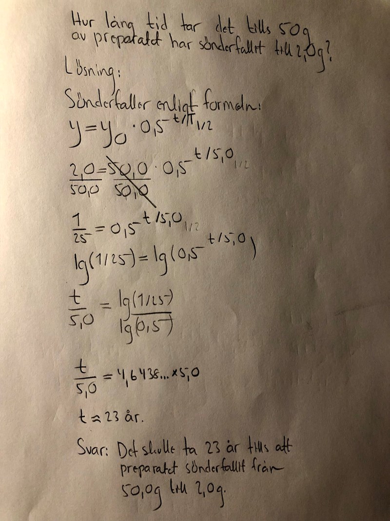 Jag blev lite förvirrad när det stod ^t/T1/2 i exponenten. Jag trodde att jag skulle ha med allt och det var även därför som det ej blev rätt. Nu blev det i alla fall rätt! 😊