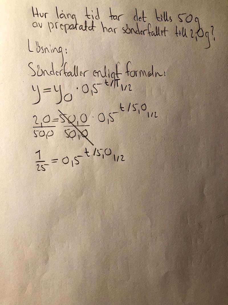 Jag dividerar bort 50,0 från HL och får: 1/25 = 0,5^t/T0,5