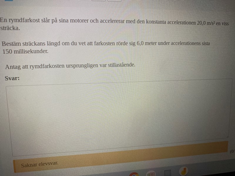 Om du menar att hastigheten var 0 när t = 0 så stämmer det, men det är ju vid tidpunkten "150 ms innan accelerationen är klar" som vi vill ha hastigheten! Då är rymdfarkosten uppe i nästan hela sin totala hastighet.