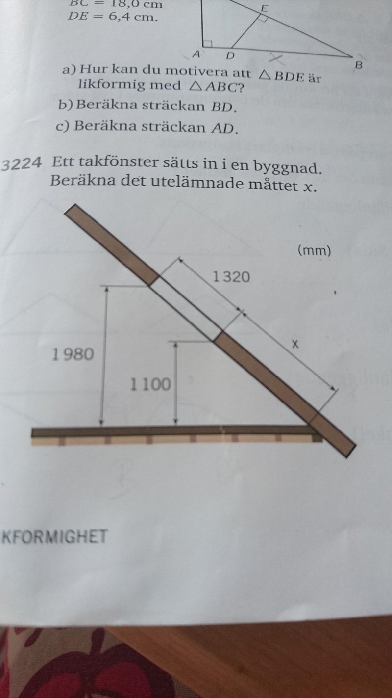 Ett takfönster sätts in i en byggnad. Beräkna det utelämnade måttet x