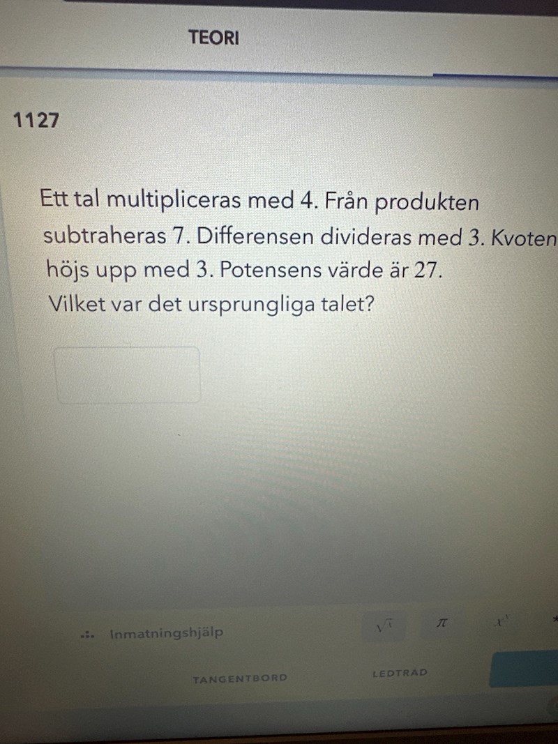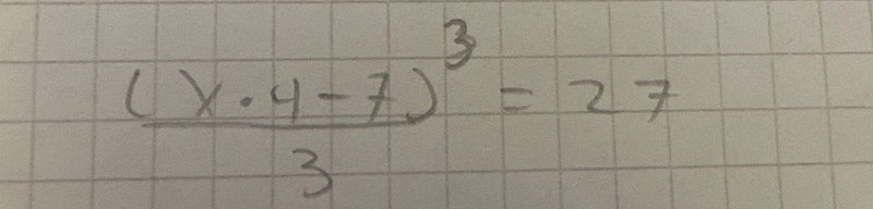 I den här typen av uppgifter så tar man ett tal och gör sedan det ena och det andra och det tredje med det. För att få tillbaka talet gör man bara omvändningen till allting. Det sista man gjorde var att upphöja till tre. Omvändningen till det är att ta tredjeroten.
