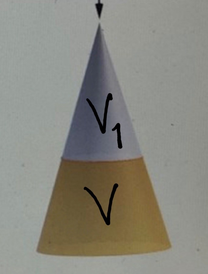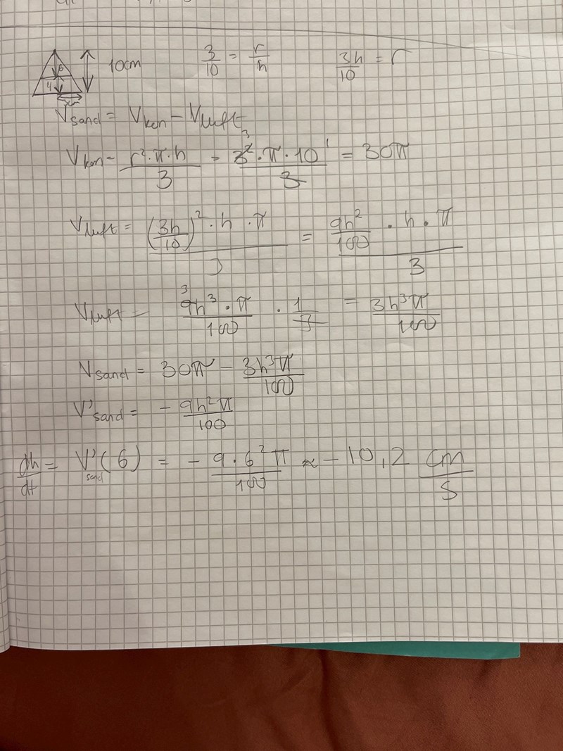 Istället borde det vara , dvs att sandvolymen () är lika med konens totala volym minus den del lägst upp i konen som fortfarande är fylld med luft ():