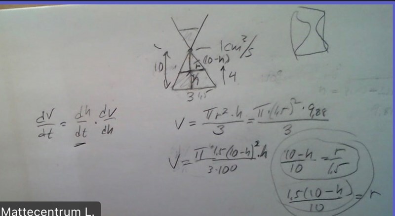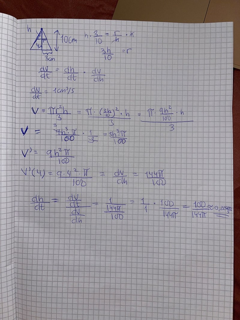 Och du behöver använda kedjeregeln dV/dt = (dV/dh)•(dh/dt), där dV/dt är känd och du har beräknat dV/dh i din senaste uträkning.