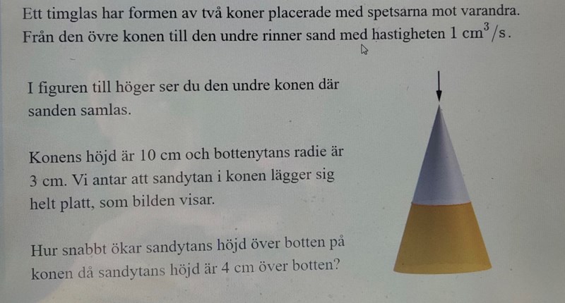 Det här förstod jag inte riktigt ”När konen fylls på med sand så kommer sandytan att höjas, dvs h kommer att öka. Samtidigt kommer sandytans radie att minska.”