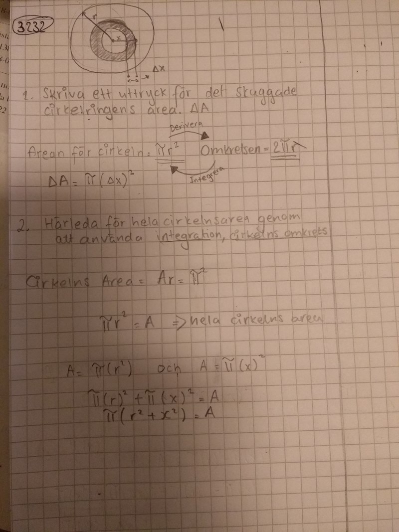 Sedan tänker jag att om Δx hade varit 1 så hade rektangelns area varit lika stor som basen och eftersom man från början vecklade ut cirkelringen till en rektangel så borde man kunna få fram omkretsen på basen genom att använda omkretsen för en cirkel dvs 2πr