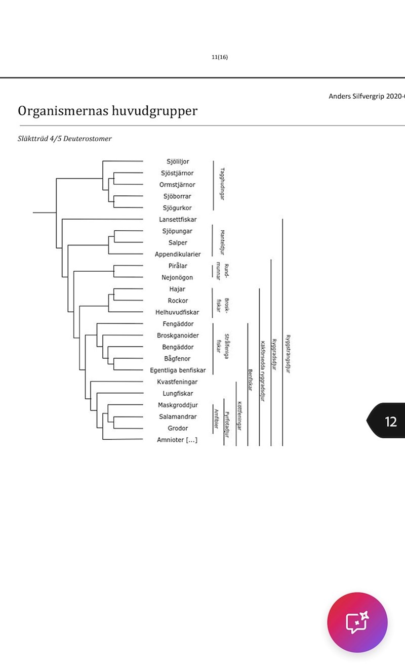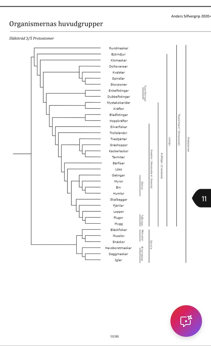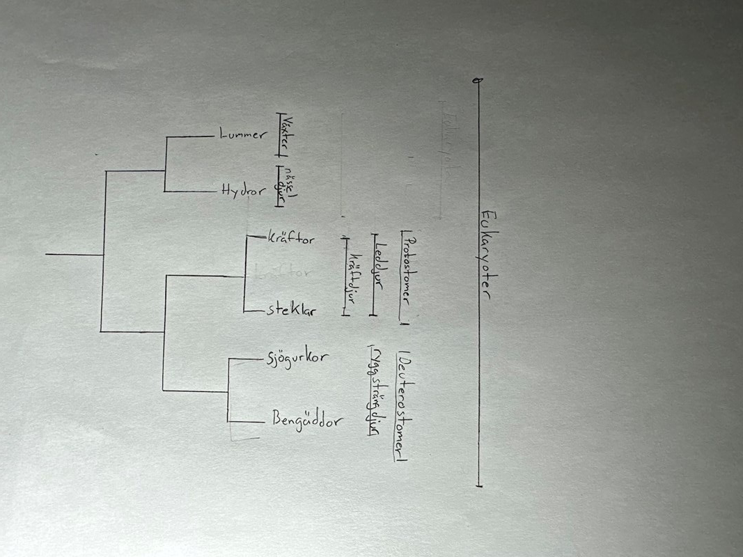 Fråga: rita en släktträd för sjögurkor, Bengäddor, hydror, lummer, steklar och kräftor.