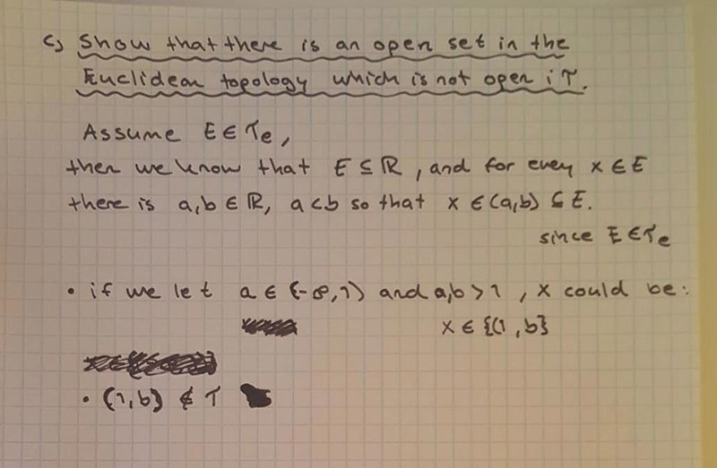 PATENTERAMERA skrev:Jag har lite svårt att följa med. Vilken öppen mängd i den Euklidiska topologin anser du inte är öppen i topologin som genereras av B?