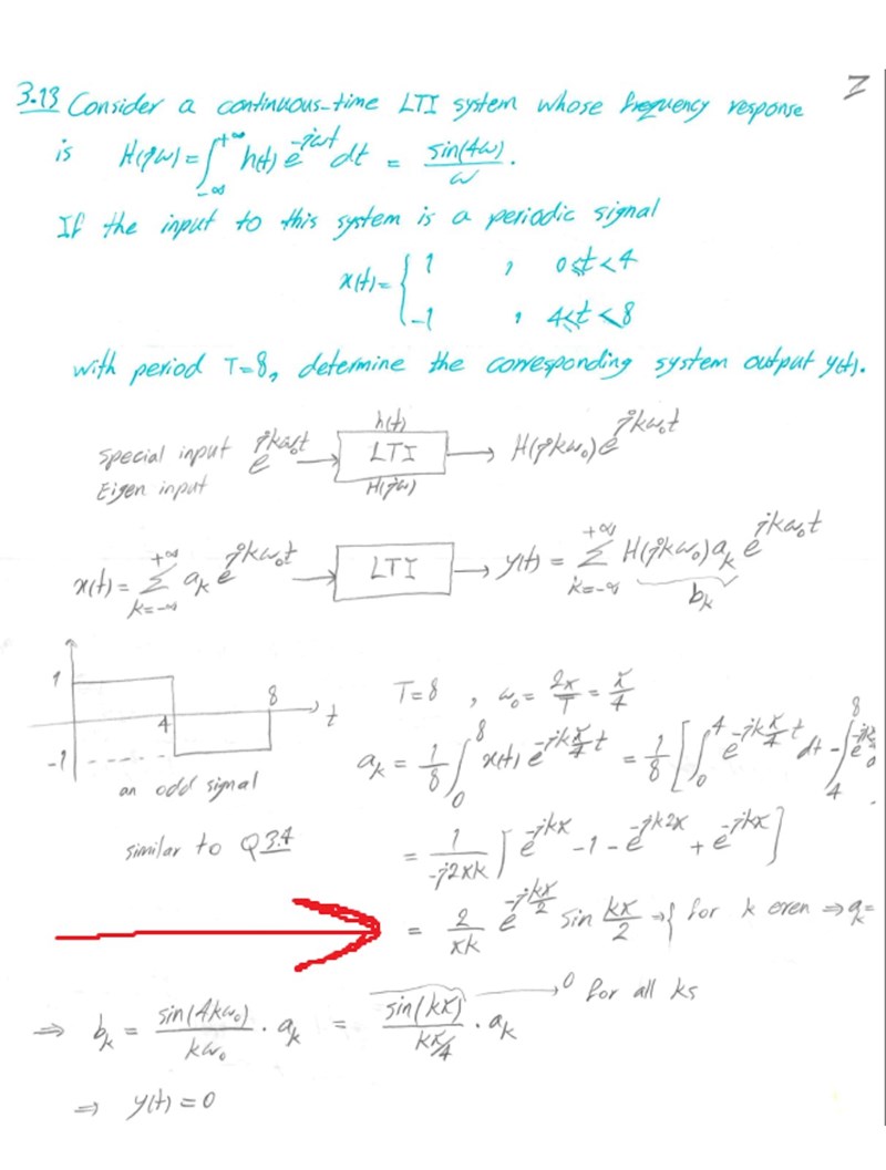 Hej. Lite osäker hur man kommer fram till röd pil. Antar att det är någon Eulers utveckling men vad händer med nämnaren? Och vi borde få ett uttryck med cosinus då vi har e upphöjt till pi och 2pi?