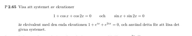 Du har två ekvationer på första raden: 1+cosx+cos2x=0 och sinx+sin2x=0. Vilken av dem är det du har "översatt"? Du behöver inte blanda in "i" för att lösa detta ekvationssystem.