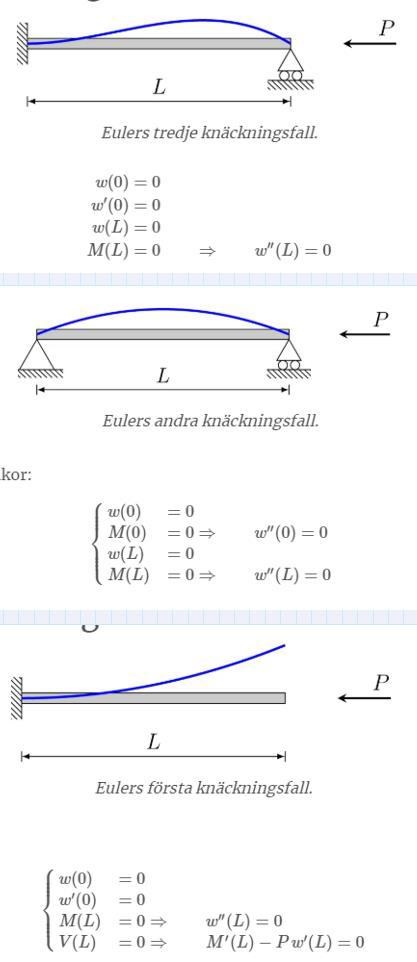 Hej försöker förstå mig på eulers knäckningsfall. Men har lite svårt att förstå varför randvilkoren är som dom är. Jag förstår att böjningen w(0) är 0 vid inspänningen och även för dirivatan av börjningen eftersom böjningnen måste ut rätvinkligt från väggen. Det jag e mest förvirrad är varför M(0) o M(L) är som dom är för de olika knäckningsfallen