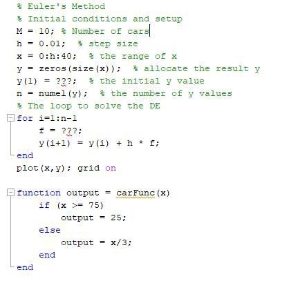 b hänger ihop med a. Du ska stega fram systemet bit för bit med Euler-ekvationerna. De diff-ekvationer som det rör sig om är bara typ y'(x) = f(x). Så det är bara: bil 4 har hastigheten si och så (som ges av avståndet till bil 3) och då vet vi dess position h sekunder senare. Osv. Bil M kör på med konstant hastighet, säger du, men jag ser inte det i bilden. Om man låter den göra komplicerade saker blir det nån generell funktion g, så de har bara förberett för det. f är den som anges av kurvan och som du har definierat i Matlab. Var allt börjar står inte, men du kan ju anta att de står med 10 m mellanrum och står stilla och sedan M börjar köra, så ska till slut allt ringla iväg. Står det vad h ska vara? Ta nåt bra annars, t.ex. 0,1 s.