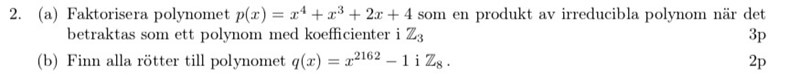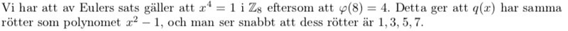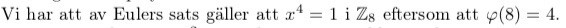 Jag skulle behöva hjälp med att förstå varför x2162 är x4 enligt Eulers sats i modulo 8? Jag fick det till x2 när jag räknade själv eftersom att φ(8)=4 (eulers funktion) så vi får att x4*540+2=x2 (mod 8) eftersom att (x2)540=1 (mod 8).