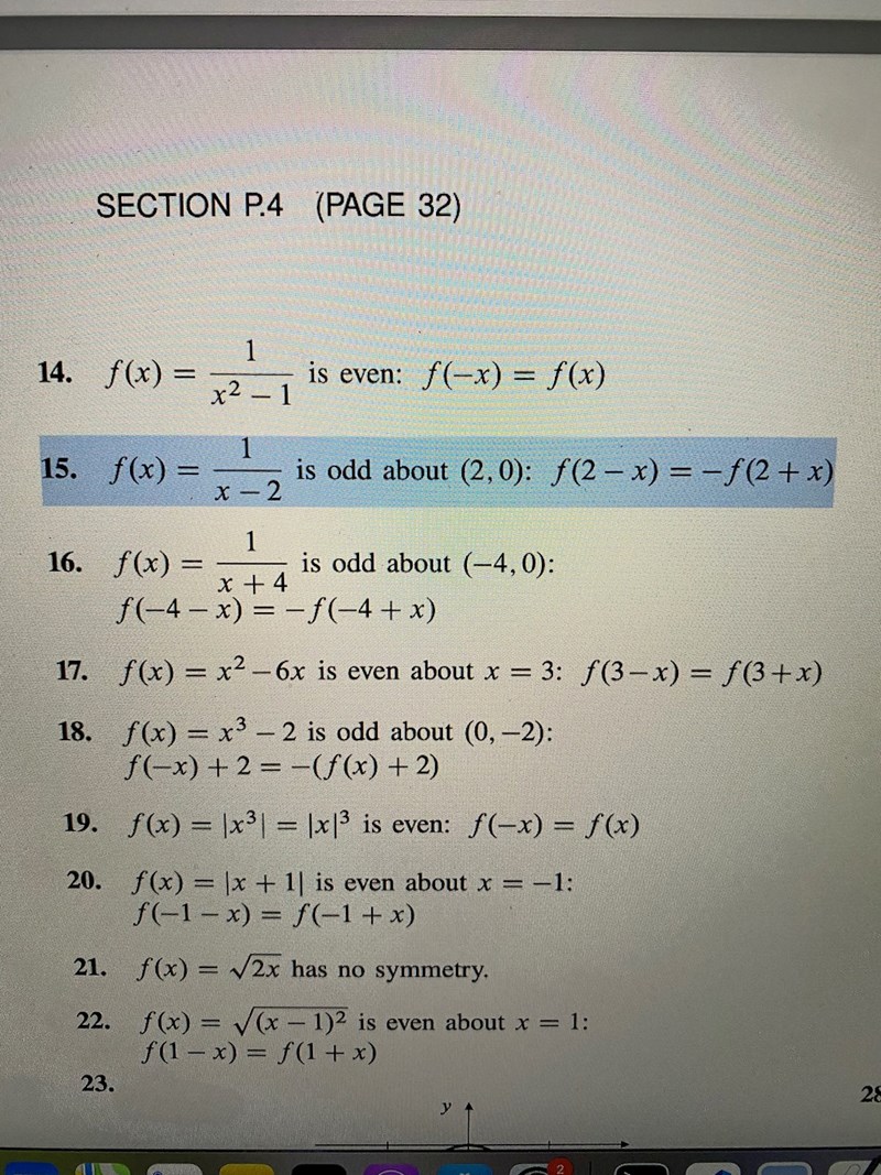 Tycker inte om att det står i facit på 15 att "f(x) is odd about (2,0)" . Det borde stå "f(x) is odd about x=2"