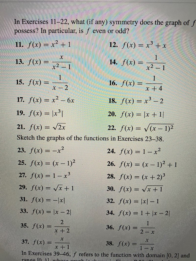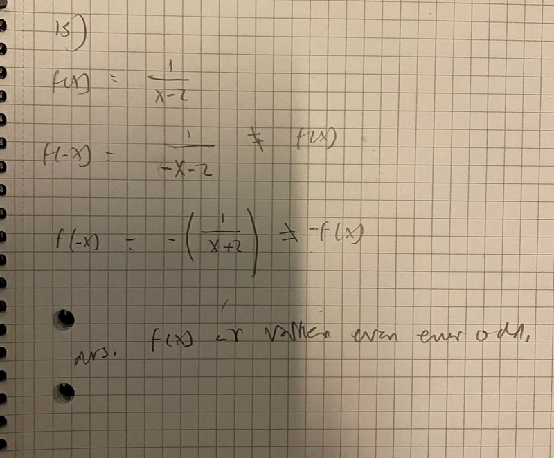 hej, jag behöver hjälp med uppgift 15 . Jag trodde att funktionen varken var jämn eller udda ( uppgiften går ut på att ta reda på huruvida funktionen är jämn eller udda) men facit verkar ej hålla med. Jag undrar därför, hur tänker facit ?