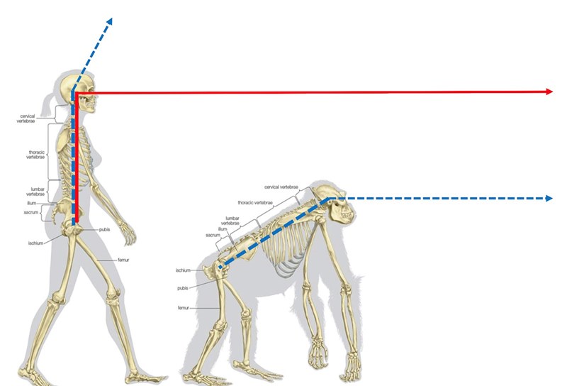 Skulle inte vinkeln ändrats hos oss, skulle vi titta upp i luften, och samtidigt som vinkeln ändrades centrerades tyngdpunkten - eftersom vi har betydligt mindre yta att balansera på, utrymmet mellan benen är ju mindre, och vi behöver balansera hela kroppens vikt på endast en punkt när vi går (primater balanserar på minst två punkter när de går).