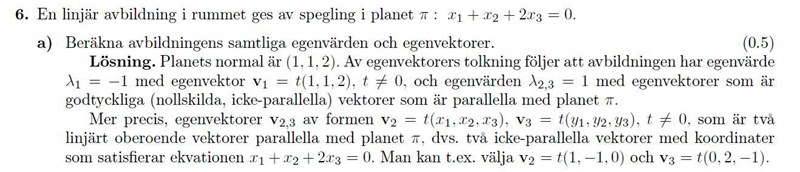 Då får du börja tänka, om jag speglar en vektor i detta plan, vad händer? Hur beskriver jag detta problem enklast? (svaret är att tolka det i basen givet av normalen till planet och två linjärt oberoende vektorer som spänner upp planet). Vad händer med exempelvis normalen? Jo, den hamnar ju "på andra sidan i normalens riktning" (alltså speglas...) i planet, så normalen till planet uppfyller alltså att . Då ser vi att normalen är en egenvektor tillhörande egenvärdet .