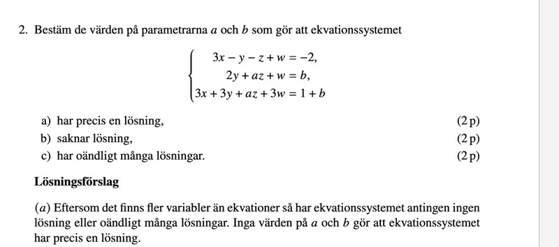 Vilka metoder har ni lärt er för att lösa ekvationssystem och diskutera kring antal lösningar? Har ni t.ex. pratat om Gausseliminering och bundna/fria variabler eller pivotelement?