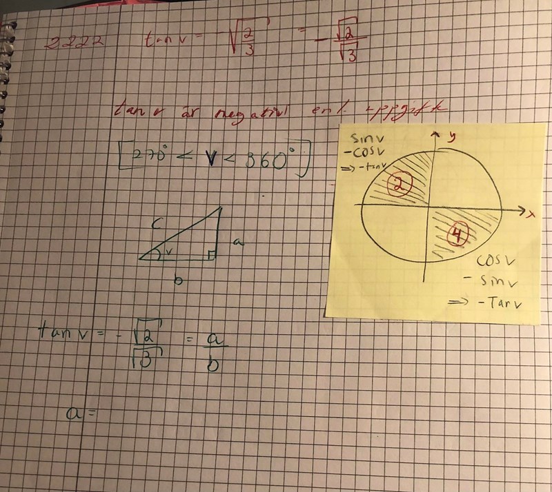 Tips: Eftersom tan(v) är negativ så måste v antingen ligga i kvadrant 2 eller kvadrant 4.