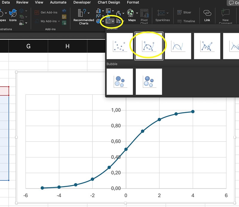 Välj/markera dina data, klicka på fliken "Insert" (Infoga) och välj sedan "Scatter chart with Smooth lines.