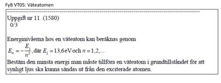 Här lite problem med denna uppgiften under. Det är inte beräkningarna i sig som jag inte greppar utan snarare hur händelseförloppet ser ut. Jag försökte rita ett energinivådiagram för att förstå men fattar inte mellan vilka nivåer det förflyttas mellan. I facit skriver de om en övergång mellan nivå 3 till 2 (är nivå 3 längst ute då?) och sedan räknar de då differensen mellan grundtillståndet och nivå 3 vilket jag ej fattar varför. Lite hjälp hade uppskattats :)