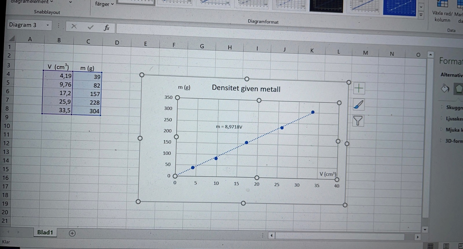 Din ekvation verkar stämma med linjen, men hur var uppgiften ställd egentligen? Fick du värdena i tabellen givna?