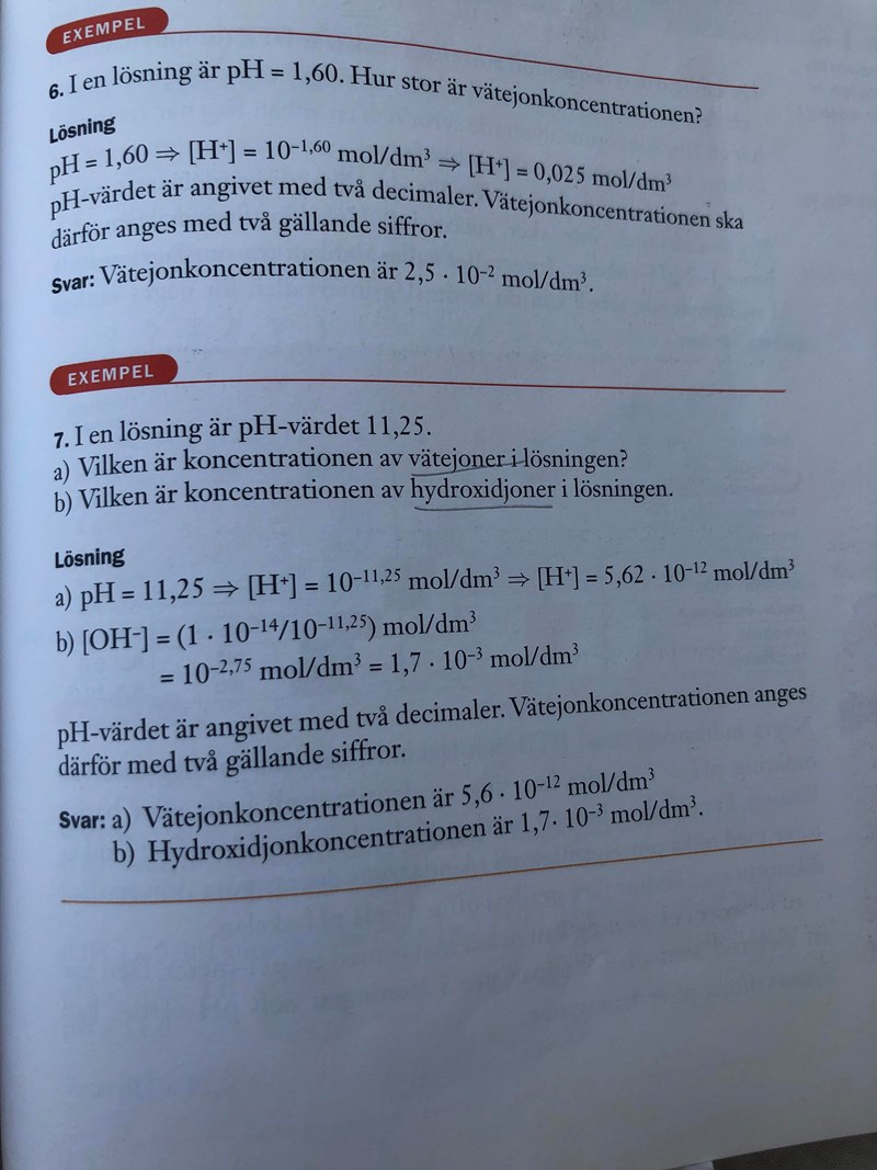 Det betyder att POH (hydroxidjonkoncentrationen) =14-11,25=2,7. Men detta är fel enligt uträkningen nedan (på bilden)