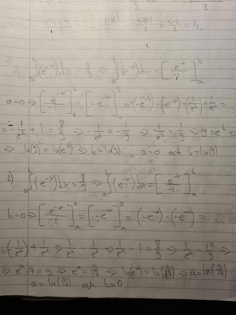 Som rubriken lyder ska man ge exempel på a och b så att integralen blir 8/9? Hur kommer jag vidare i uppgift 5?