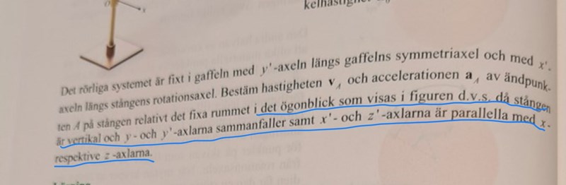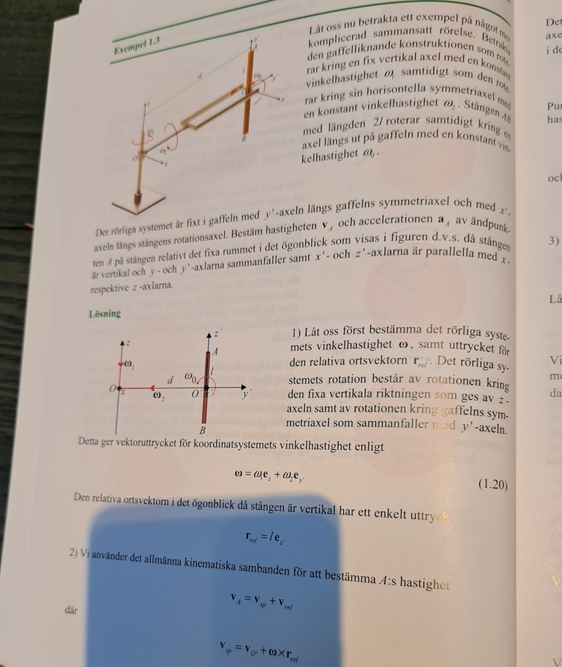 Jag tror inte jag förstår deras figur riktigt (den andra bilden alltså)  där du menar att punkterna har hastighetsvektorer i dessa riktning?  Men gällande v=w×r kanske du menar att d=dey' och w1ez=w1ez' pga ez och ez' är parallella , om man kryssar w1ez' med dey' så får man ju -w1dex' och samma sak gör man med v_rel. Fast jag förstår inte skillnaden mellan dem vo' och vrel  , vo' är väl den relativa hastighet i det rörliga systemet där O' rör sig medan den andra hastigheten är den relativa hastighet i någon punkt?