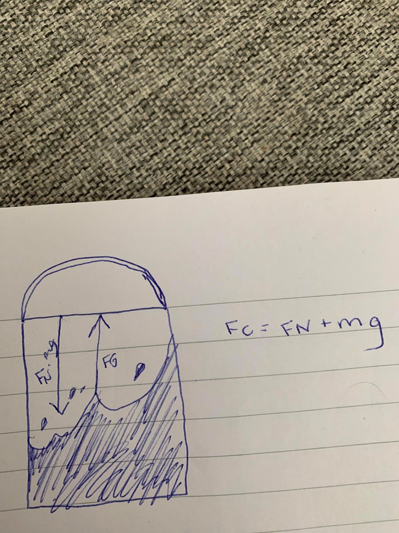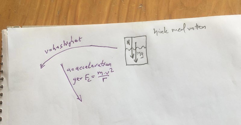 Det andra felet du gör är att det finns inga andra krafter som verkar på  vattnet, än N och mg. Fc är summan av de verkande krafterna, så du får INTE rita ut den om du redan ritat ut N och mg.