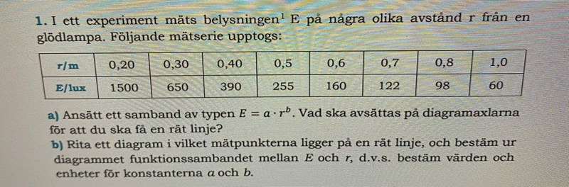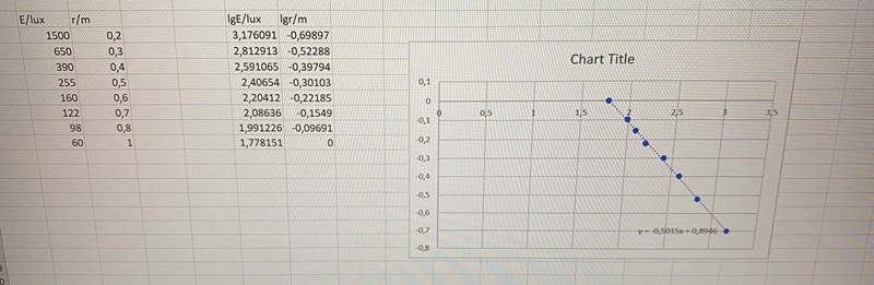 På excel la jag in de mätvärdena på E och r som anges i frågan. Sedan tog jag lgE av alla E värden och lgr av alla r värden. Jag behöll enheten lux för E värdena och enheten m för r värdena (borde jag ha gjort om till några andra enheter först?).