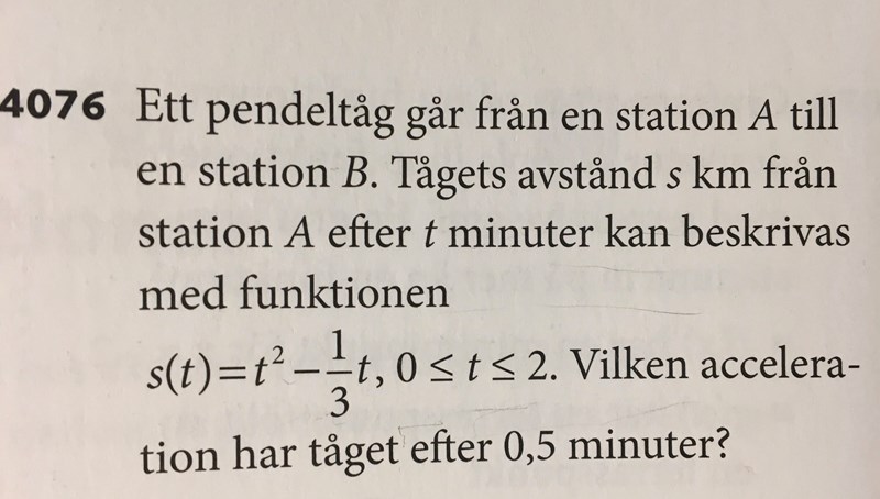 Jag skulle behöva hjälp med denna uppgift. Om jag har förstått rätt får jag tågets hastigheten av förstaderivatan och accelerationen av andraderivatan så jag började med att derivera funktionen