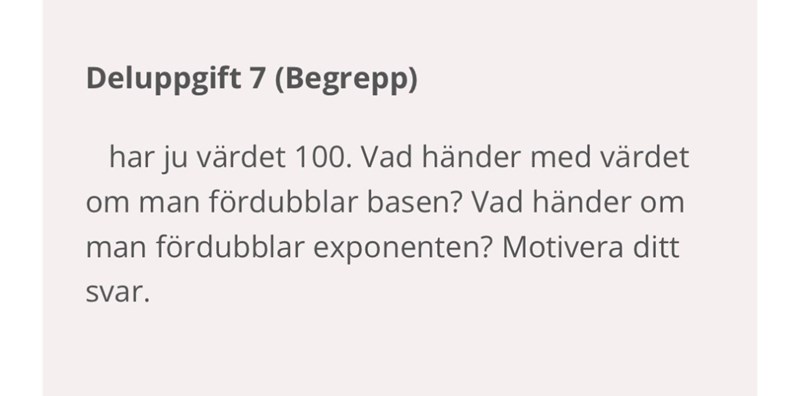Jag menade att om det ursprungliga uttrycket är ab så får man (2a)b = 2b•ab om man dubblar basen och a2b = (ab)2 om man dubblar exponenten.