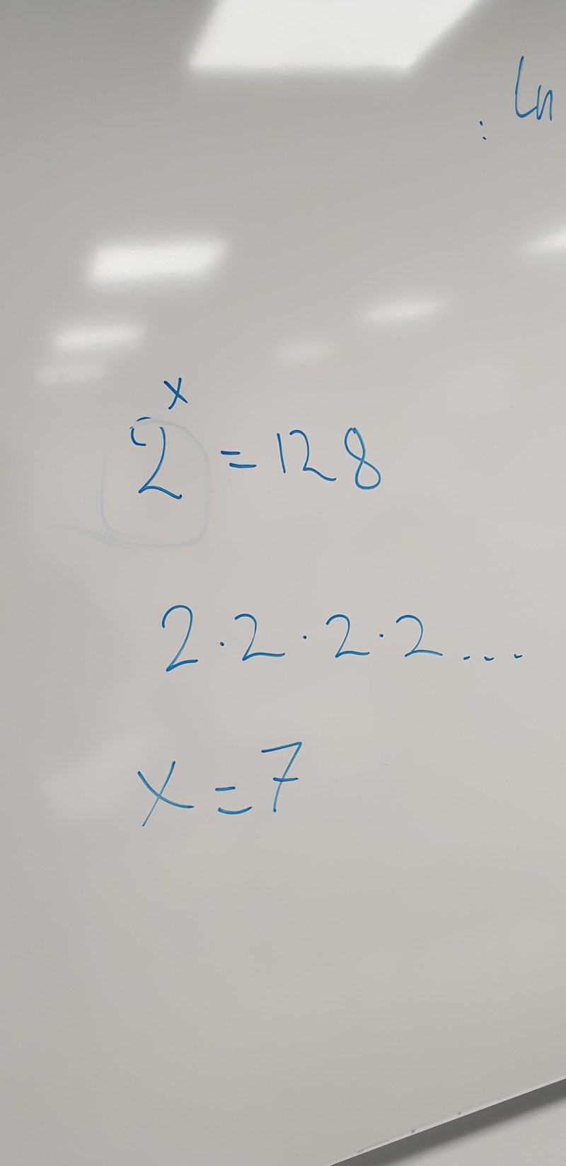 1. Skriv om 128 till 27. Då har du ekvationen . Vad är x?