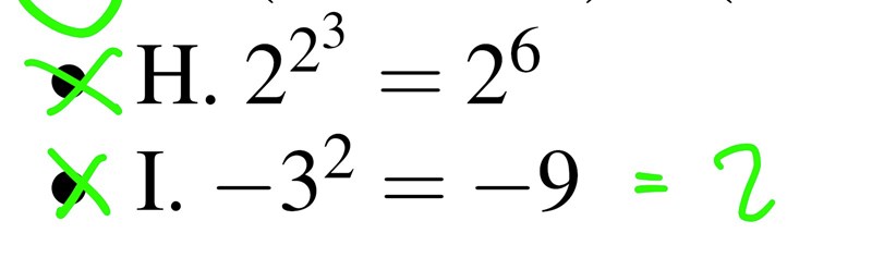 tack så himla mycket för svar! en annan fråga gällabde I. jag tänkte först att det skulle stämma inte skulle stämma eftersom -3•-3=9 men det är väl att isåanfall hade det stått (-3)^2 eftersom ( ) ej finns räknar man istället 3^2 enligt följden att exponenter räknas före -. Vilket då blir -9.