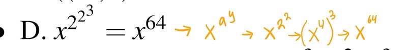Jaha! Så när det ärr ”dubbel” exponenter höjer man upp exponenterna innan man tar hänsyn till basen dvs i detta fall 2^3= 8 (exponenter)