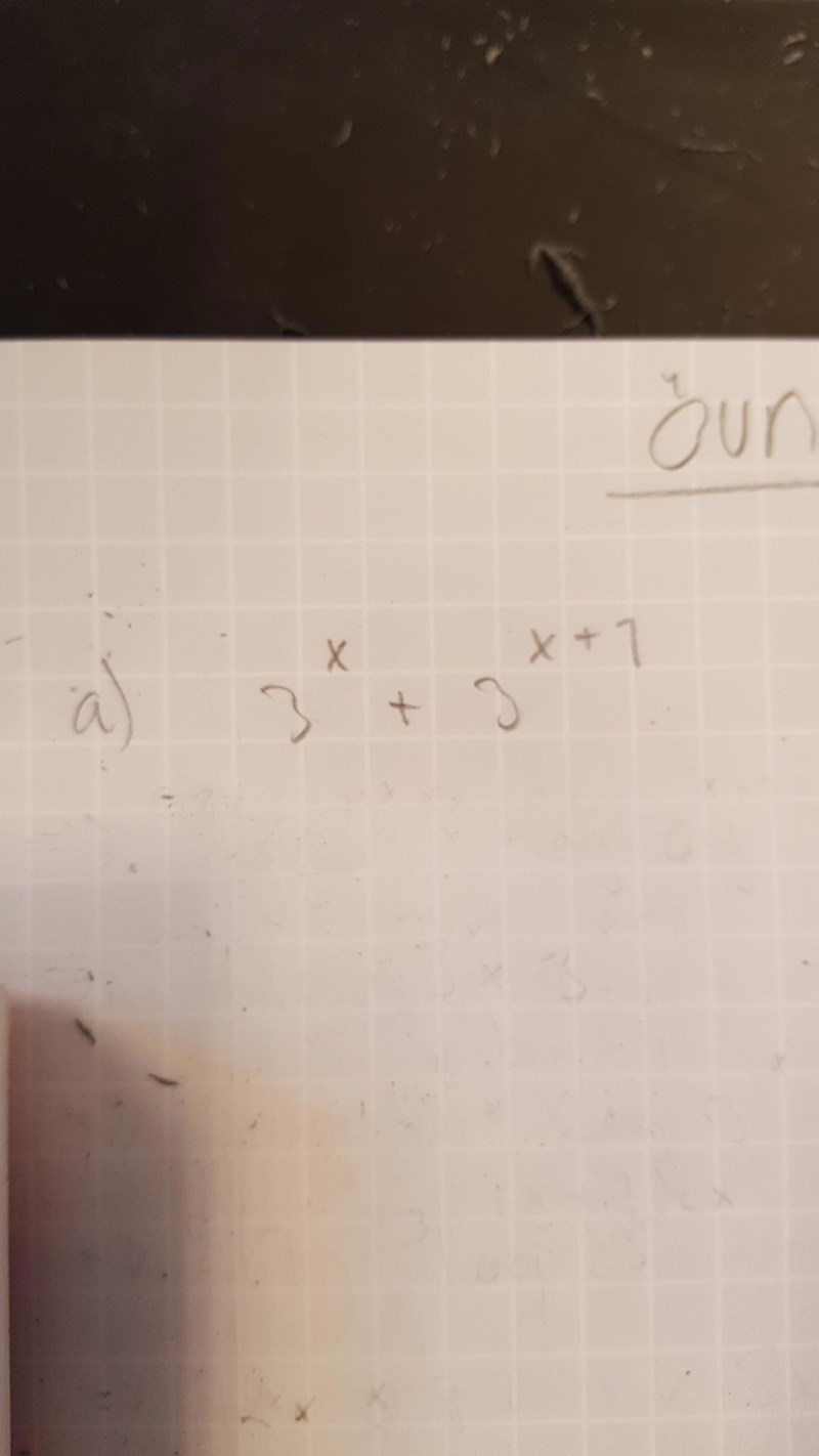Bryt ut faktorn 3x 3^x . När du gjort det bör du förstå vad PeBo menar.