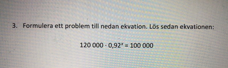 Inte helt rätt, men problemet kan se ut så här: En bil köps för 120 000 kr och bilens värde minskar med 8 % per år. Hur många år dröjer det innan bilen är värd 100 000 kr?