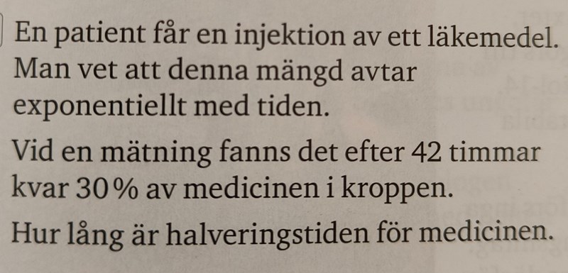 Yngve skrev:Du vet att när det har gått 42 timmar så är det 30 % kvar av ursprungsmängden.