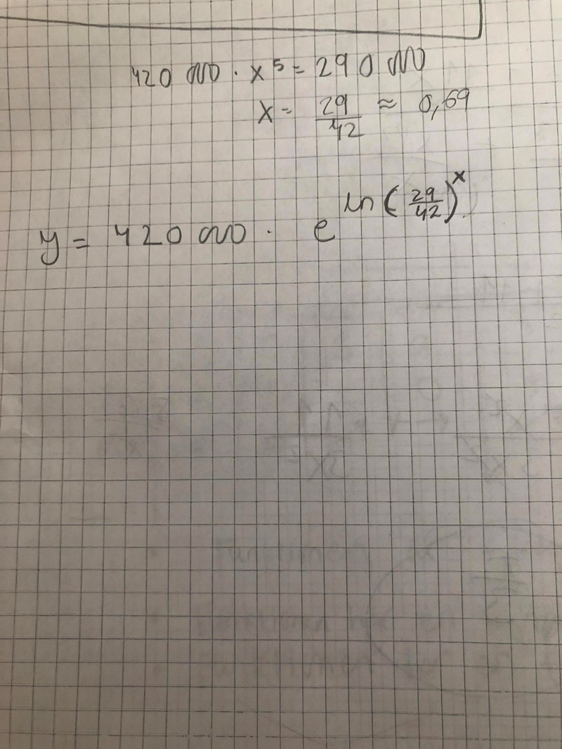 Värdet av en segelbåt minskar exponentiellt med tiden. Segelbåten köptes för 420000kr för fem år sedan och idag är den värd 290000kr. Bestäm en exponentialfunktion med basen e som beskriver segelbåtens värdeminskning.
