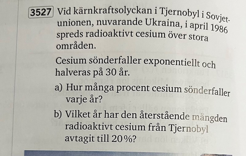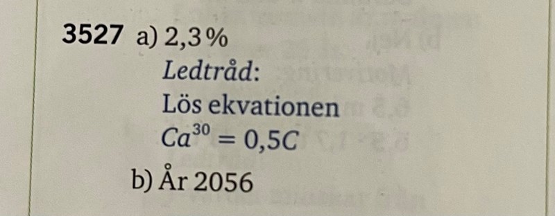 Jag har räknat ut att svaret på a blir ca 2,3% och att ff är 0,97715996, men fattar inte alls hur jag ska göra på b. Jag fattar det som att 0,2C= C • 0,977715^x ? För jag vet ju inte vad C, alltså den totala mängden på cesium, är? Så det går ju inte att räkna