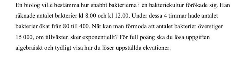 Börja med att skriva upp en exponentialfunktion som visar att biologen har 80 bakterier från början och 400 bakterier efter 4 timmar. Kalla förändringsfaktorn a. Visa din ekvation innan du försöker lösa den, så vi ser att du jobbar med rätt ekvation.