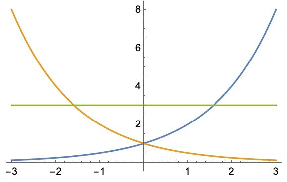 och 2^-x=3 har ett x värde som är ca -1,6 enligt grafen.