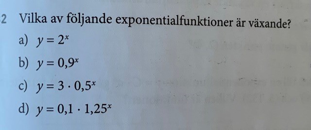 det värdet du fått på stämmer inte, testa att slå det igen. a) och d) är växande.