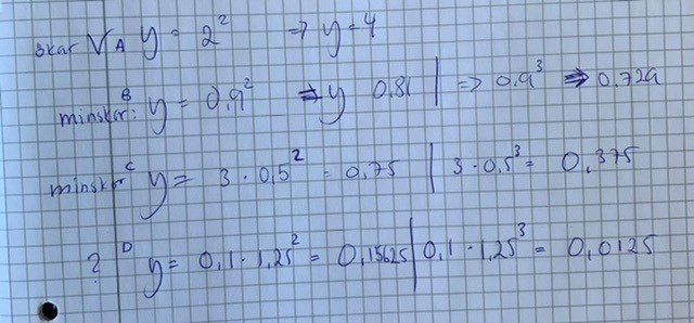 När man tittar på dessa funktioner så tänker jag spontant att a och d ökar. Men när jag sedan multiplicerar d med startvärdet C (y= Cxa^*) som är 0,1 så minskar det ju?